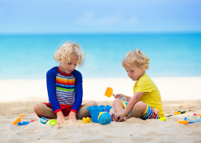If your child is a bit older, they can help guide you on your walk or drive (e.g., turn left at the light, then walk down two blocks). Once at the beach, you can use descriptive language to discuss everything you see. Play “I Spy” and see if your child can guess what you are describing and then take a turn being the describer. You can help your child interact with other kids at the beach by modeling appropriate phrases such as “do you want to play with me?” or “let’s go swim!”